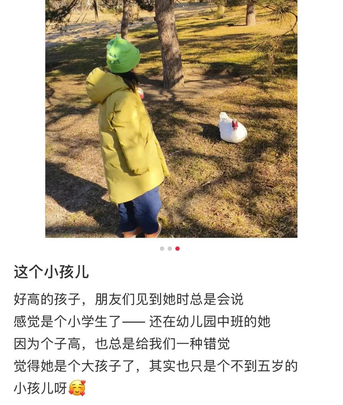虽然齐溪这次没有让两个女儿的正脸完全露出来,但还是能看出大女儿个子很高,这大概是遗传了父母的好基因。前几天,齐溪还在社交平台上发过一张大女儿的近照,说她不到五岁,还是个幼儿园的小朋友,但因为个子高,看起来像是上小学的大孩子了。照片里,小姑娘戴着绿色的帽子,穿着黄色的长羽绒服,粉色手套,一身打扮鲜亮又活泼。她对着镜头开心地笑着,眼睛弯弯的,感觉眉眼之间还真有点像妈妈齐溪。